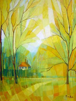 The Red Roof shows a house in the woods in gold, orange, and red colors in Cubic Extensionism.